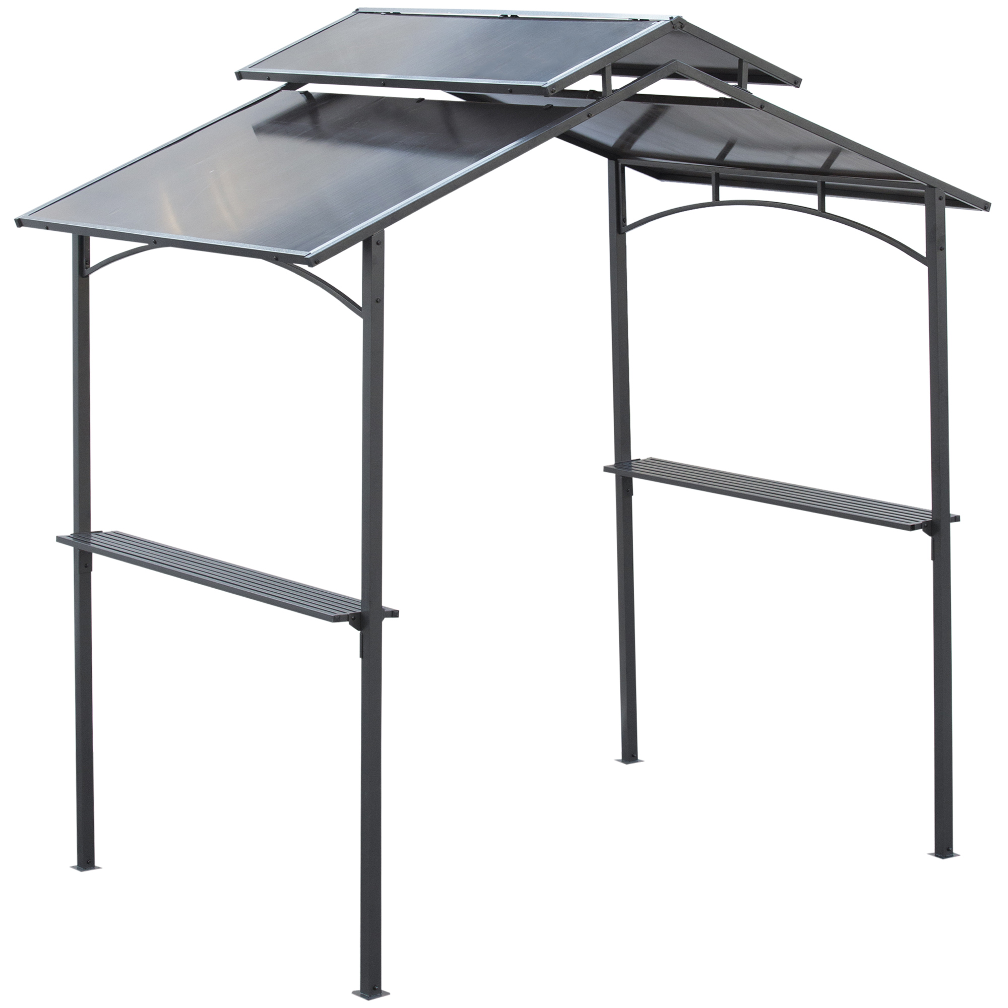 Foisor de Gradina pentru Gratar din Otel Acoperis Dublu si Rafturi. Pregatirea unui gratar frumos pentru a va bucura in companie este distractiv, dar sa o faceti sub soare poate fi obositor. Stati la adapost cu foisorul practic pentru gratar Outsunny! baldachinul sau protejeaza de razele UV si datorita designului pe 2 niveluri favorizeaza dispersia caldurii si a fumului. Are o structura metalica solida cu 2 rafturi laterale practice, pentru a tine la indemana tot ce aveti nevoie. O piesa de mobilier pentru gradina ta functionala si inevitabila!