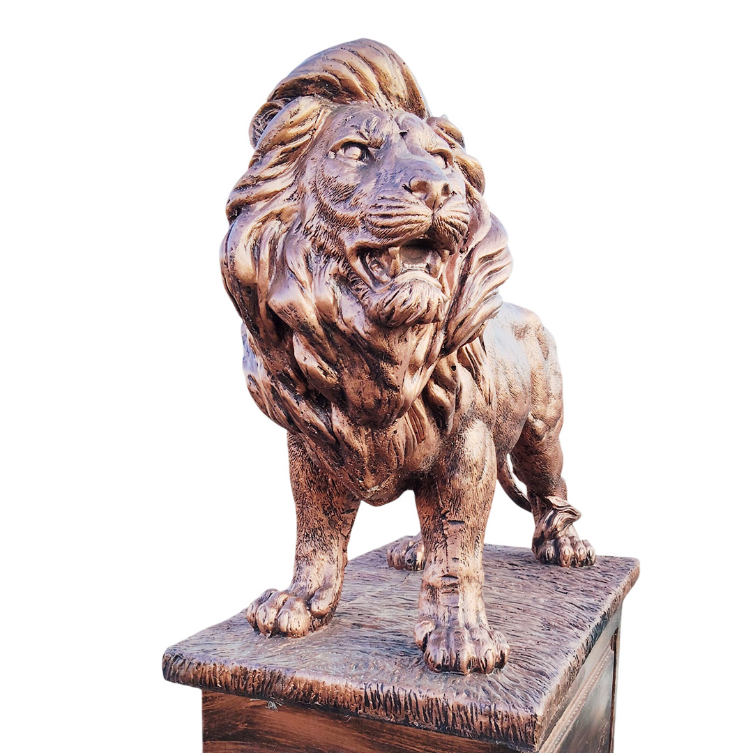 Leu mare de grădină, realizat din ciment, cu finisaj elegant auriu antichizat, ideal pentru decorarea spațiilor exterioare. Designul impunător și detaliile bine definite oferă un aspect nobil și rafinat, potrivit intrare casă, zone rezidentiale, pentru parcuri, grădini, terase sau alei.