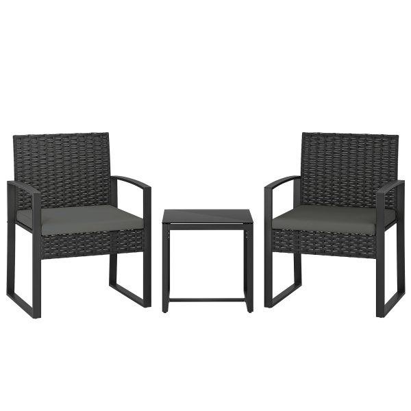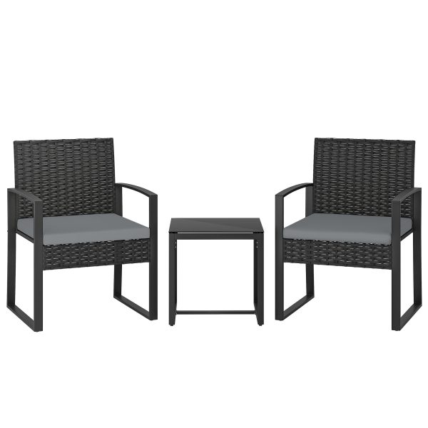 Set de Grădină 3 Piese din Rattan PE și Oțel, Set cu 2 Fotolii cu Perne Lavabile și Măsuță de Cafea cu Blat din Sticlă, Set de Mobilier pentru Balcon, Terasă sau Curte, Gri Închis și Negru | Aosom Romania